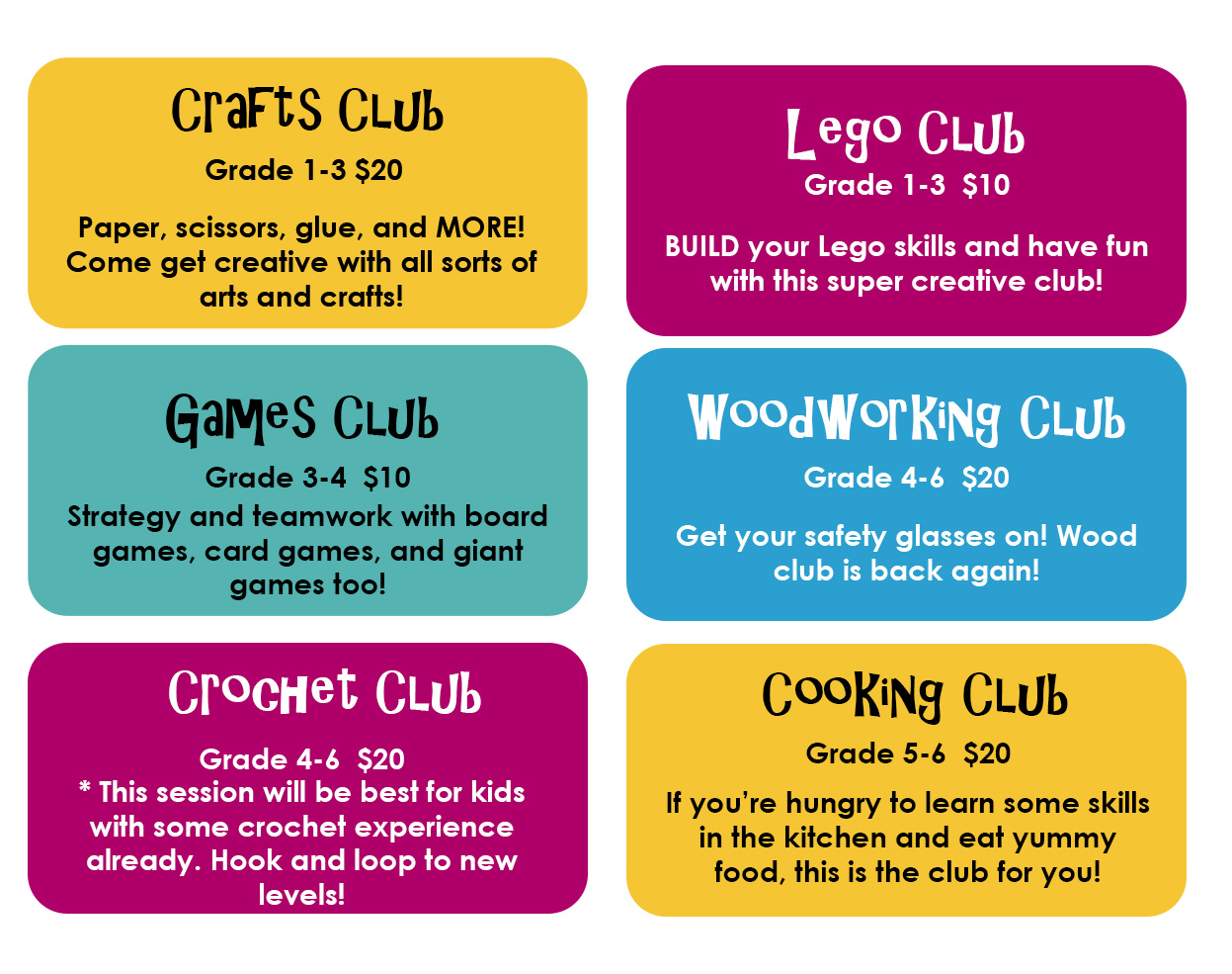 All clubs are now FULL! Please register for the waiting list to be notified if a space opens up.